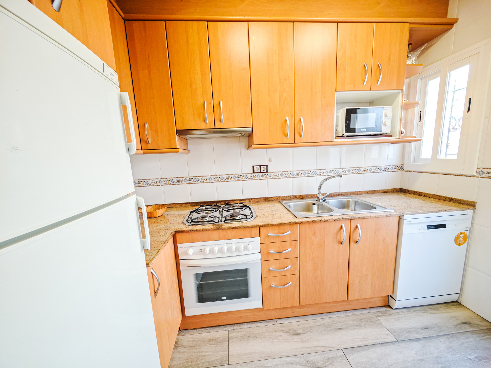 La cuisine, entièrement équipée, est un espace indépendant avec une plaque vitrocéramique et dispose d'électroménagers de première qualité tels que réfrigérateur, machine à laver, congélateur, machine à café, four, lave-vaisselle, micro-ondes, grille-pain et vaisselle complète. Idéale pour préparer de délicieux repas en famille.